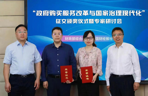 2022年9月20日,财政部综合司(票据中心)联合中国财经报社在京举办“政府购买服务改革与国家治理现代化”征文颁奖仪式暨专家研讨会。综合司(票据中心)二级巡视员吴东胜、中国财经报社社长万平出席仪式,并为获奖代表颁发获奖证书。