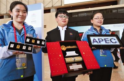 11月9日,国家会议中心,志愿者展示APEC纪念徽章(左)、北京城市钥匙(中)和APEC经济体建筑拼图徽章套装(右)。