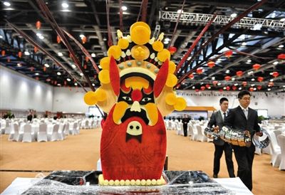 昨晚举办APEC工商领导人峰会晚宴的餐厅,让贵宾切身体会博大的北京文化。宴会厅门口搭建起红色牌楼,服务人员均穿戴上京剧舞台服装迎宾。此外,京味儿十足的京剧脸谱、泥人、面塑也都出现在餐桌摆台,尽显老北京风情。