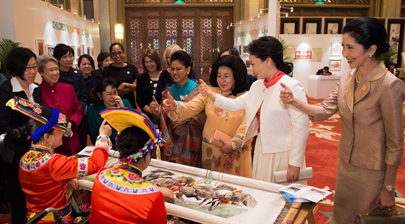 彭丽媛热心地给夫人们示范:“这是‘谢谢’。”“这是‘我爱你’。”“这是‘你好’。”……夫人们也学着用手语向两位姑娘表达对她们精美作品和顽强精神的称赞。