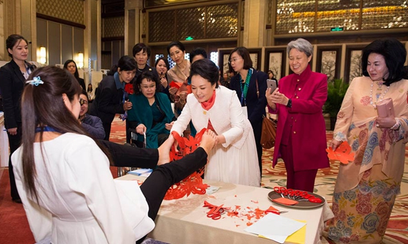 剪纸展台前,夫人们对剪纸姑娘夏红的“心灵足巧”佩服不已。彭丽媛拿起夏红剪出的一张张大红福字送给夫人们,告诉大家“这代表着欢乐和幸福”。彭丽媛还接过夏红用脚递来的剪纸“和平鸽与爱心”,展示给夫人们看。夫人们应邀拿起剪刀一试身手。加拿大总理夫人劳琳很快剪出了一只蝴蝶,夫人们纷纷为她鼓掌。