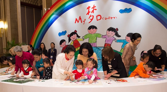北京会议中心的会场里,展示着一些自闭症儿童的绘画,笔触稚嫩,却有着丰富的想象和斑斓的色彩。彭丽媛和来宾们仔细观看,新加坡总理夫人何晶还拿出手机拍照。