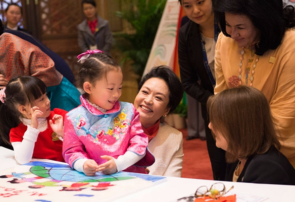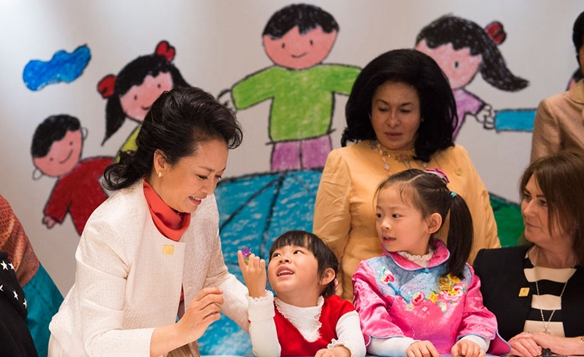 看到彭丽媛和夫人们的到来,孩子们很高兴,笑着喊道“阿姨好!”彭丽媛和夫人们也笑着回应,走进孩子们中间。