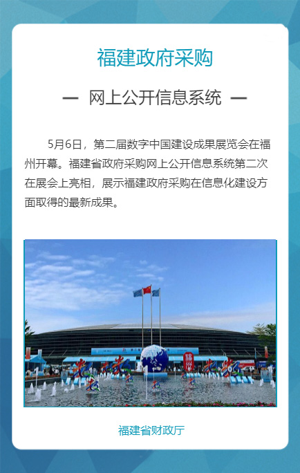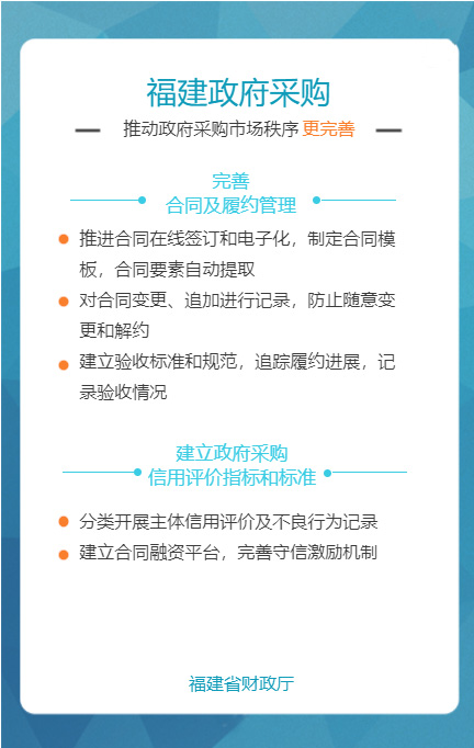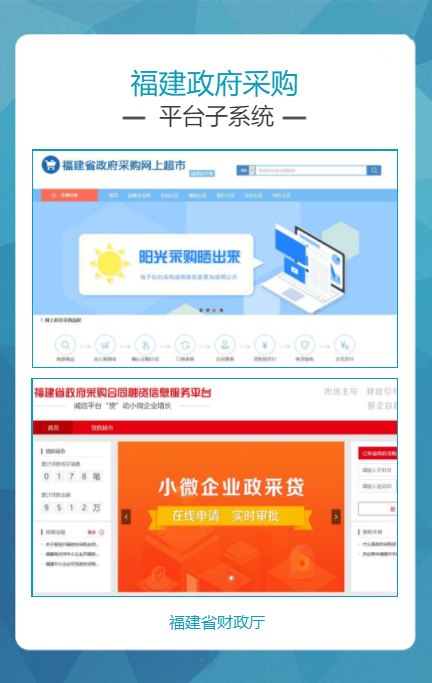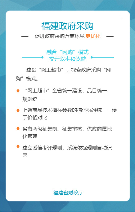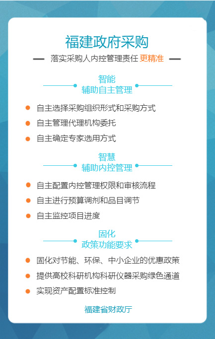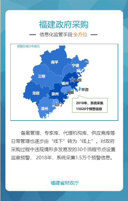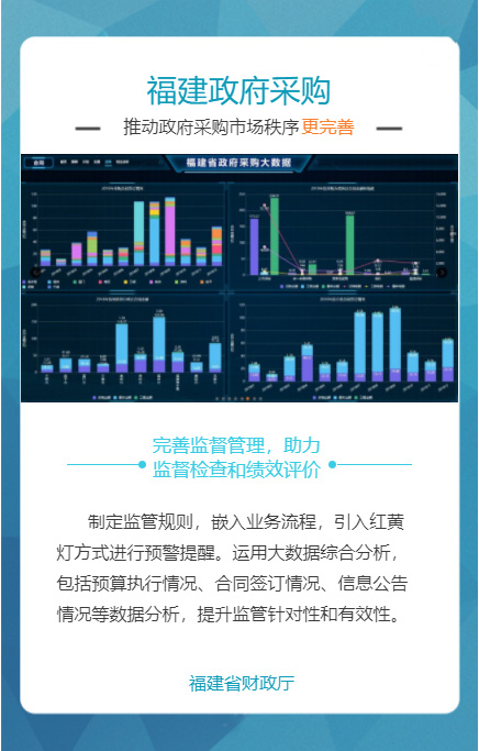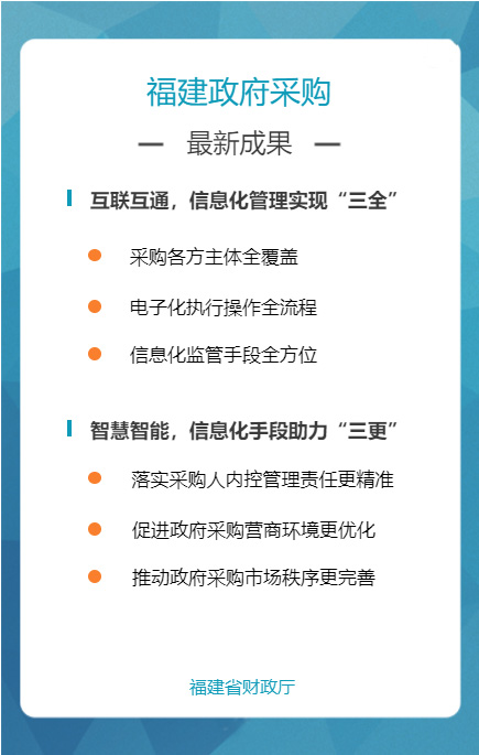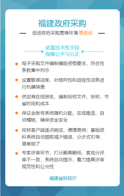 “福建省政府采购网上公开信息系统”是针对政府采购活动中存在的采购效率低、价格高、采购期长,以及各种不规范问题而组织建设的,通过充分运用云计算、大数据、电子商务等新技术新业态,创新体制机制,整合共享资源,管理创新获得国务院领导肯定。