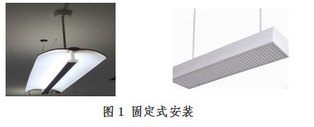 从安装方式来看,教室灯具可分为固定式安装或嵌入式安装。固定式安装是指教室灯具固定安装在天花板等材料表面,如图1所示;嵌入式安装是指教室灯具嵌入安装在天花板的方式,如图2所示。固定式灯具适用的安全标准为GB7000.201-2008,嵌入式灯具适用的安全标准为GB7000.202-2008。